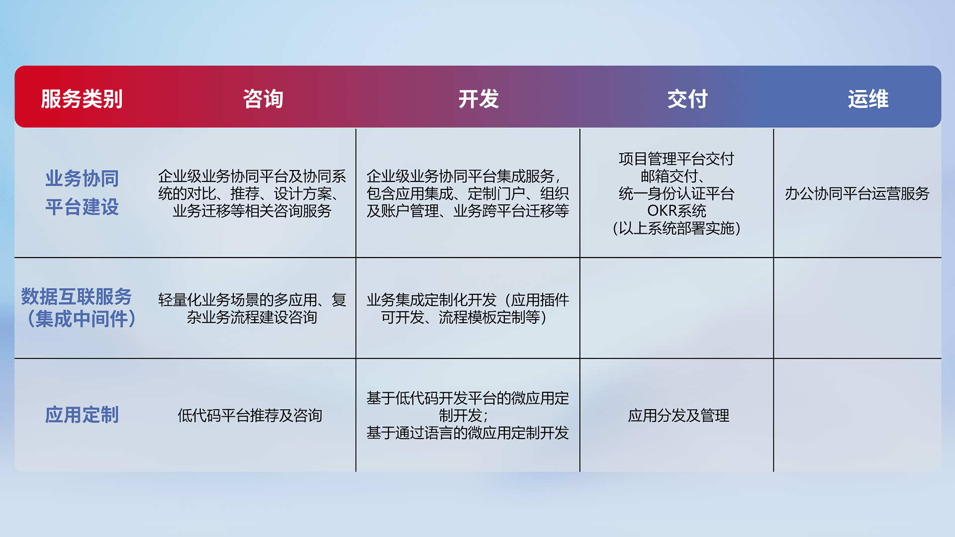 针对钉钉、、、企微、、、、IDaas等平台级产品提供产品的规划、、、、方案、、交付、、定制化开发等服务,,,,实现如统一协同办公、、、智能客户服务、、、、混合会议管理、、、、智能数据查询、、、等业务场景,,,实现数字化转型。。。