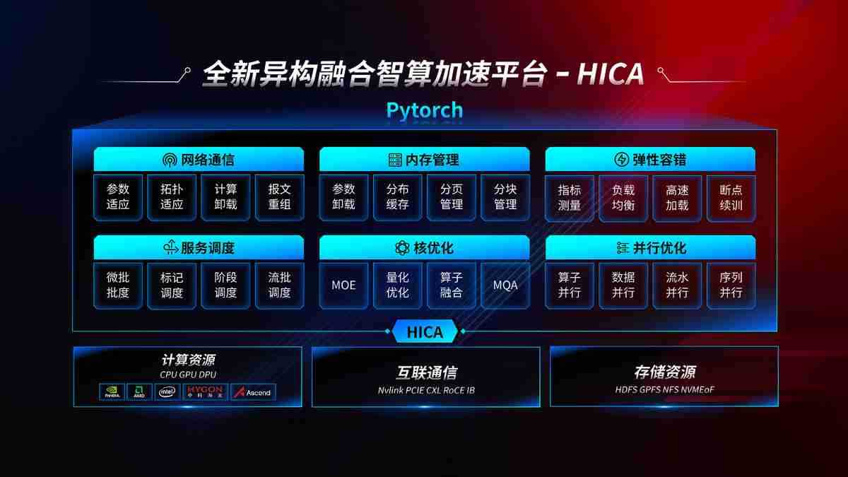 通过自研的服务层、、中间适配层、、、以及调度编排算法,,,采用数据并行、、、、模型并行等多种并行方式,,,,把并行计算任务进行有效的分解,,,使其分别由相应的软件栈和算力资源来承接。。当GPU资源变化,,HICA可以实时动态调度计算子任务并调整模型拓扑和架构,,以充分聚合各种算力资源。。