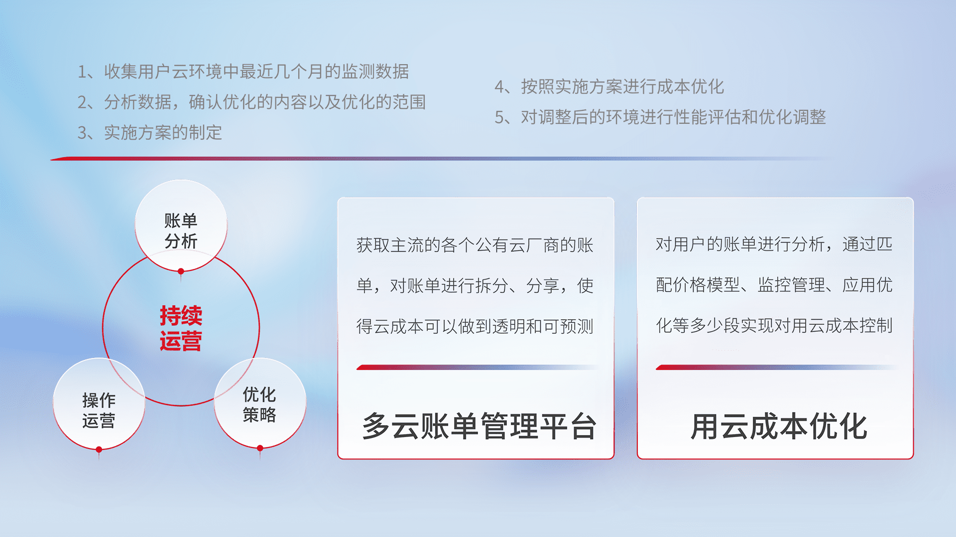 通过多云纳管,,,以统一的资源数据模型把客户的云资源进行抽象和封装,,,,进而实现对多云资源的统一操作,,,,保障云资源管理的可靠性、、、稳定性与可用性。。。量身定制化运维内容,,配置、、、、开发运维、、、、补丁管理、、备份、、监控、、、认证和访问管理、、、审计和日常巡检等,,保障在用云过程中的可靠度,,,稳定度以及高可用率。。。。